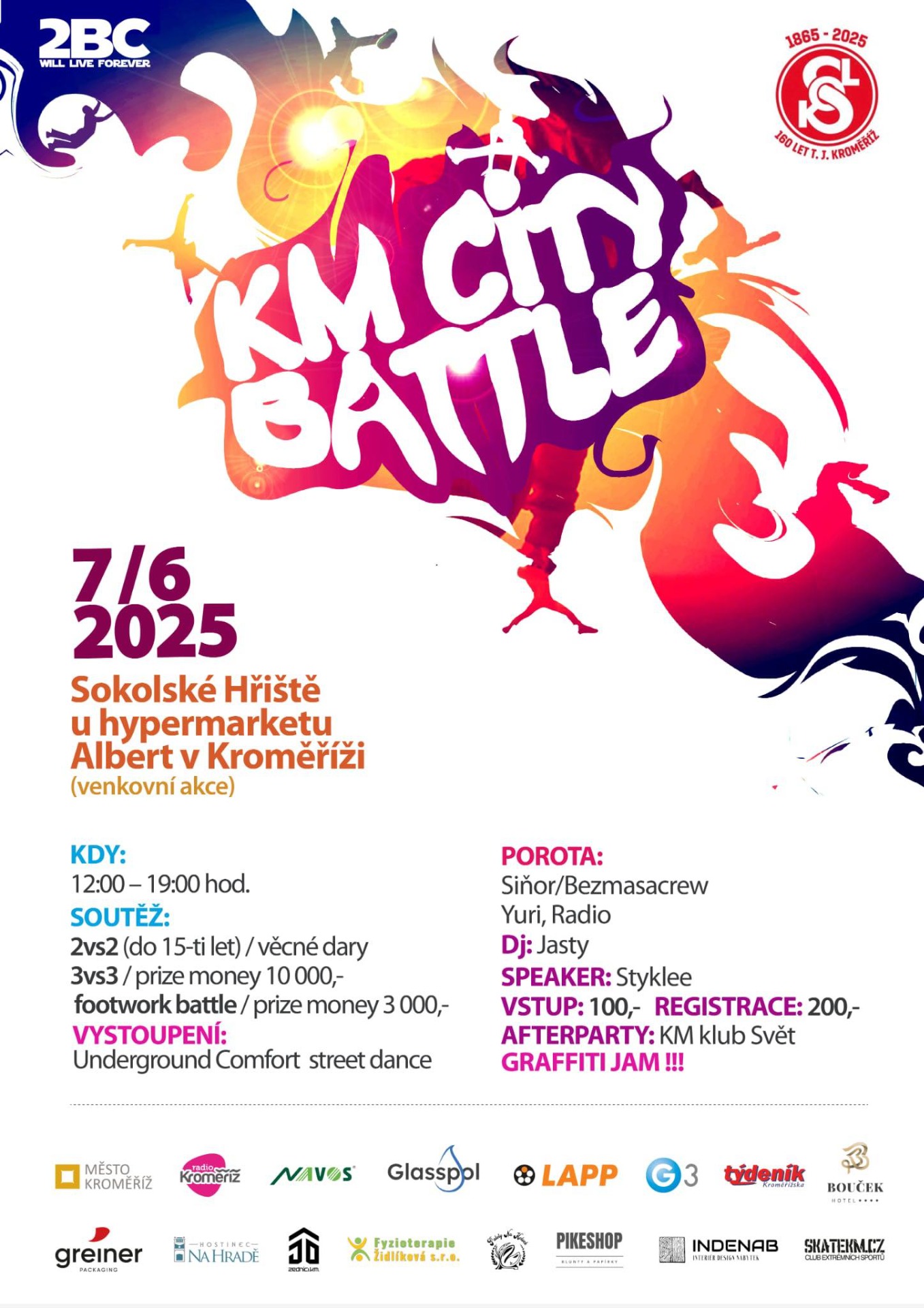 5. Ročník KM CITY BATTLU a zároveň první venkovní akce spojena s graffity jamem. Break dancevou akci nám doprovázel DJ Jasty James jeden z nejlepších DJ v Evropě!! Porotu jsme měli z top tanečníků ČR Siňor,Yuri a Radio z Kroměřížské skupiny 2BC. Soutěžilo se v kategoriích 2vs2 do 15-ti let. Všichni výherci byli z 2BC Kroměříž 3.místo Michal Franek s Dominikem Zaoralem. 2.místo František Gajdošík s Matějem Hanákem a na 1.místě Jakub Olša s Vendulkou Osinovou A ano jedinou slečnou, která se zúčastnila na KM CITY BATTLEU. Další kategorie byla 3vs3 kde vyhráli Borci z Brněnské skupiny Bezmasacrew. Poslední kategorie byla Footworl tam vyhrál borec z Vyškova Vaša. Celá akce se povedla i počasí nám přálo.